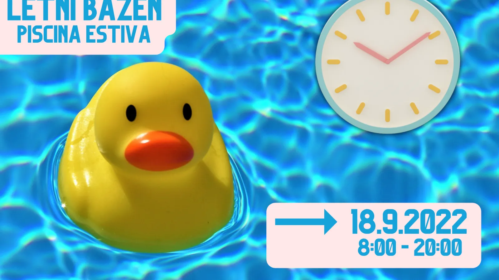 Obiskovalce obveščamo, da zaradi ugodnim vremenskih razmer kopanje na letnem bazenu podaljšujemo do 18.9.2022! Urnik je od 8:00 - 20:00, obratujemo vse dni v tednu! Hvala za razumevanje!