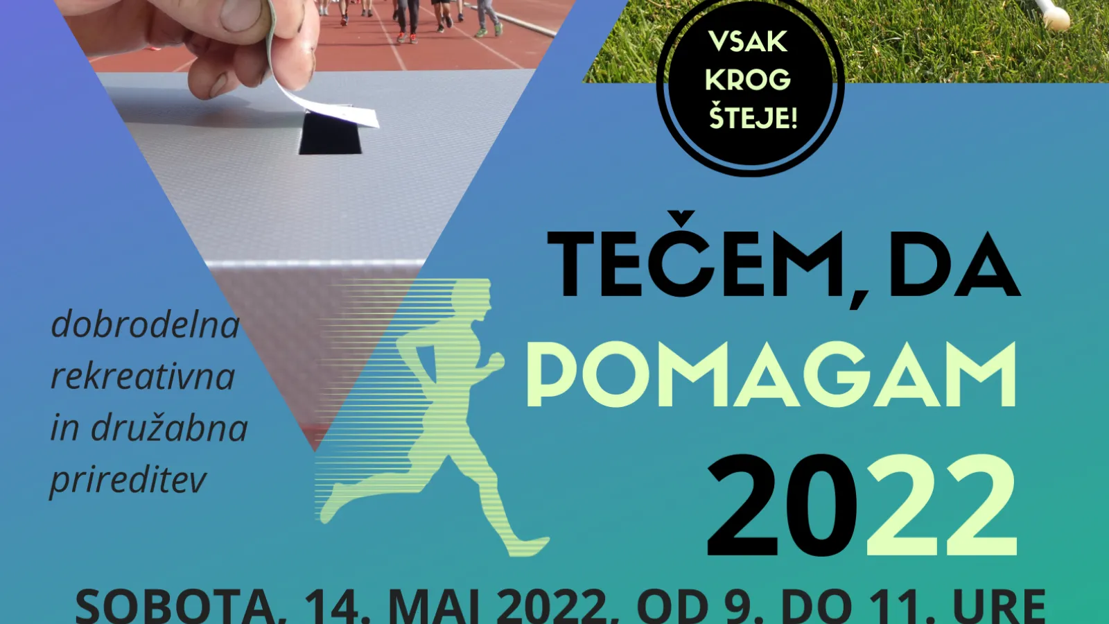 Srečamo se v soboto, 14. maja 2022, med 9. in 11. uro v Športnem parku v Novi Gorici. Prireditev, ki vključuje rekreativni tek in hojo po atletski stezi ob nogometnem igrišču, je primerna za ljudi vseh starosti in ne glede na njihove gibalne omejitve. Ob doniranem prispevku vsak prejme lističe za štetje krogov.